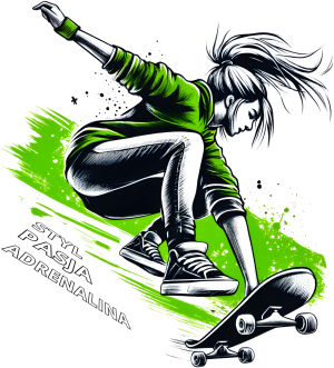 Bluza Dla Dziewczynek - Młoda skateboardzistka wykonująca skok z deskorolką - energetyczna ilustracja pełna stylu, pasji i adrenaliny w zielonej kolorystyce
