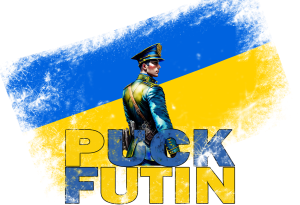 Koszulka -Napis puck futin z flagą Ukrainy i żołnierzem w żółto niebieskich barwach