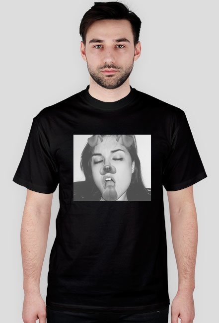 Model ma na sobie koszulkę w rozmiarze M. Maksymalne wymiary nadruku to 30cm (szerokość)