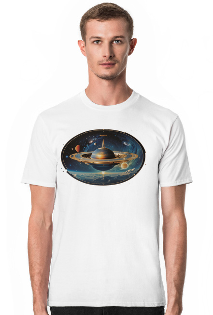 Odkryj nieskończoną przestrzeń kosmiczną z naszą nową koszulką z 100% bawełny. Ta koszulka wyróżnia się unikalnym wzorem, który przedstawia ciało niebieskie otoczone orbitującymi planetami i gwiazdami, umieszczone na tle przestrzeni kosmicznej i górskiego terenu.