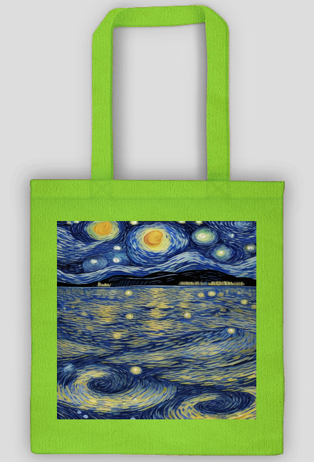 Wyobraź sobie spacer nad brzegiem jeziora w mrocznej ciszy nocy, gdzie każdy krok to spotkanie z gwiazdami. Nasza torba ECO zaczarowuje swoim wzorem, ukazującym gwieździste niebo odbite w lustrzanym odbiciu wody, nawiązującym do arcydzieła mistrza sztuki. Niech ta torba towarzyszy Ci w podróży przez czas i przestrzeń, wprowadzając do Twojego codziennego życia nutę magicznej atmosfery inspirowanej jednym z najbardziej znanych dzieł sztuki wszech czasów.