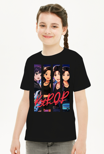 Wejdź na scenę z energią, która rozgrzewa tłumy! Ta koszulka to hołd dla k-popowej pasji i stylu, łącząca estetykę anime z koncertową dynamiką. Nadruk przedstawia cztery charyzmatyczne postacie w stylu Manga – gitarzystkę, wokalistkę, tancerkę i perkusistkę – każda w osobnym panelu, jak kadry z teledysku. Tło rozświetlają neonowe reflektory i gwiezdne bokeh, a czerwony napis „KPOP” przebija przez środek niczym logo zespołu gotowego na światową trasę.