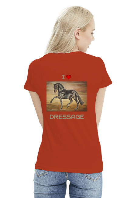 KOŃ UJEŻDŻENIOWY KARY OLDENBURG - FURSTENBALL - UJEŻDŻENIE - KOSZULKA - I LOVE DRESSAGE - NADRUK Z 2 STRON SKU: koszulka-damska_q6ywxnqw_3799980