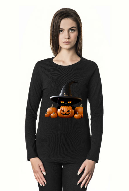 Halloween czarny kot w kapeluszu SKU: premium-longsleeve-ladies-voyage_q2hbgfq1_4703615