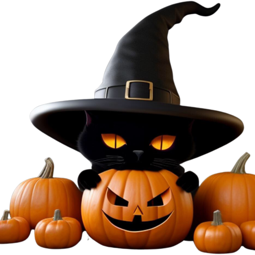 Przygotuj scenę na fantazyjnie zachwycające Halloween dzięki naszej kolekcji. Ten ujmujący projekt oddaje esencję Halloween, przedstawiając słodkiego czarnego kota ozdobionego uroczym kapeluszem wiedźmy, siedzącego obok czarującej dyni.