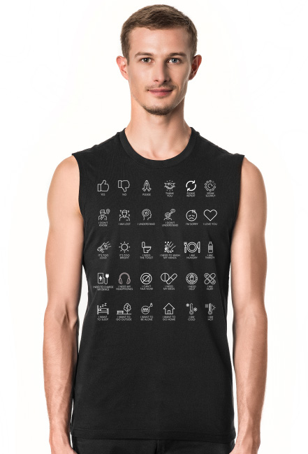 Stworzyliśmy T-Shirt komunikacyjny dla osób niewerbalnych, w spektrum autyzmu lub z problemami z mową. T-Shirt zawiera 30 piktogramów pomagających wyrazić podstawowe potrzeby. Pomoże Ci także w podróży, kiedy nie znasz lokalnego języka.