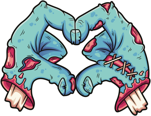 Grafika przedstawiająca ucięte dłonie po zombi układające wzór serca. Zabawna i sugestywna grafika na wiele okazji, w tym na Halloween.