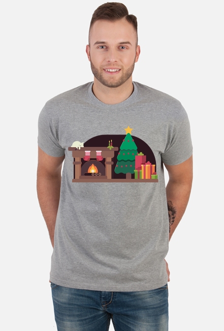 Świąteczna atmosfera - choinka - skarpeta - śnieg - prezenty - kominek - kot - Boże Narodzenie - męska koszulka SKU: koszulka-K01_oy5r4d63_3799988