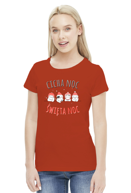 Urocze kotki w świątecznych czapkach. Napis Cicha Noc Święta Noc - Boże Narodzenie - Wigilia - śnieg - damska koszulka SKU: koszulka-damska_elnkeyu8_3806745