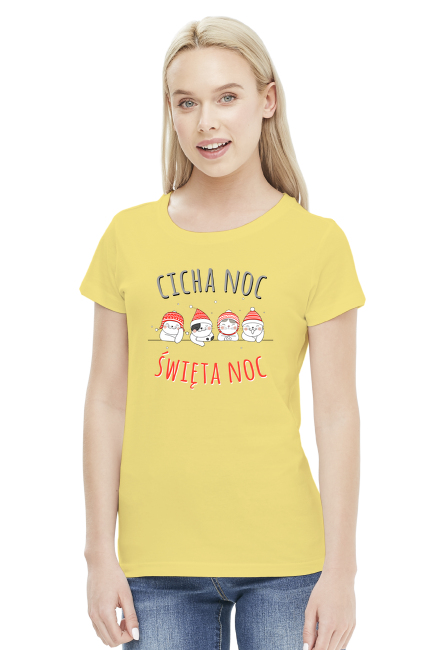 Urocze kotki w świątecznych czapkach. Napis Cicha Noc Święta Noc - Boże Narodzenie - Wigilia - śnieg - damska koszulka SKU: koszulka-damska_elnkeyu8_3806745