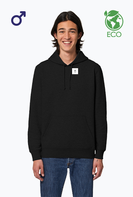 Bluza z kapturem męska z linii Eco Awar. Posiada kaptur z podszewką z pojedynczego dżerseju, kieszeń kangurkę, wszywane rękawy oraz ściągacze przy rękawach i u dołu. Skład materiałowy: 85% organiczna bawełna czesana ring spun, 15% poliester pochodzący z recyklingu. Gramatura 280 g/m². Posiada certyfikaty: GOTS (Global Organic Textile Standard), GRS, OCS, OEKO-TEX Standard 100, Fair Wear.