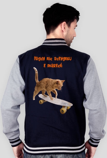 Bluza z motywem kota na deskorolce zachęcająca, żeby nigdy nie rezygnować z marzeń.