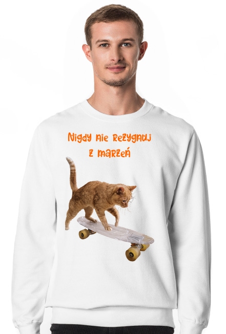 Bluza z motywem kota na deskorolce zachęcająca, żeby nigdy nie rezygnować z marzeń.