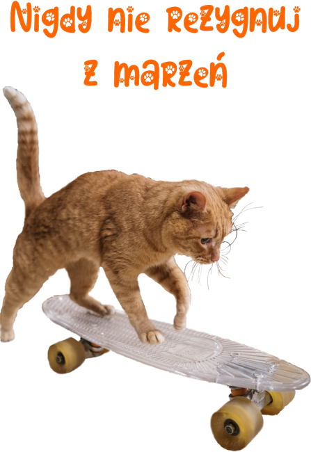 Bluza z motywem kota na deskorolce zachęcająca, żeby nigdy nie rezygnować z marzeń.