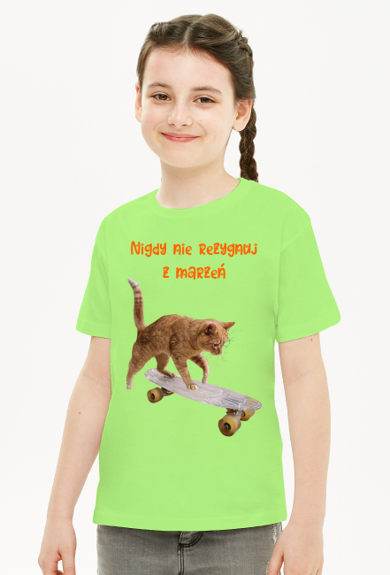 Koszulka z motywem kota na deskorolce zachęcająca, żeby nigdy nie rezygnować z marzeń.