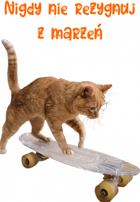 Miś z motywem kota na deskorolce zachęcająca, żeby nigdy nie rezygnować z marzeń.