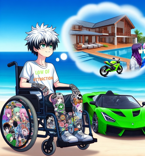 Na zdjęciu zatytułowanym "Prawo przyciągania" młody mężczyzna na wózku inwalidzkim siedzi na plaży, spoglądając w dal z wyrazem tęsknoty na twarzy. Pomimo swoich fizycznych ograniczeń marzy o życiu pełnym wigoru i obfitości. W swoim umyśle wyobraża sobie siebie chodzącego swobodnie, w towarzystwie pięknej towarzyszki, mieszkającego w luksusowej willi z błyszczącym basenem oraz jeżdżącego potężnym motocyklem po malowniczych trasach.