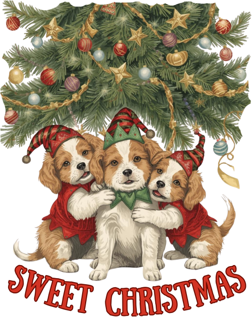 Trzy słodkie szczeniaczki w świątecznych strojach elfów tulą się pod choinką pełną ozdób. Ciepłe barwy, vintage klimat i uroczy styl – to klasyka świątecznych ilustracji.