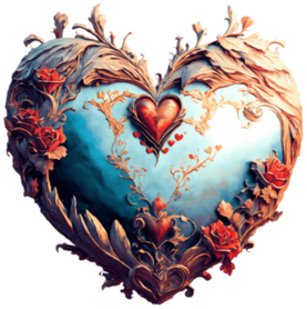 Ten obraz przedstawia ornament w kształcie serca. Ma misterne rzeźby i kwiatowe wzory, które nadają mu ozdobny i dekoracyjny wygląd. Serce ma gładkie, błyszczące wykończenie, podkreślające dbałość o szczegóły w jego wykonaniu.