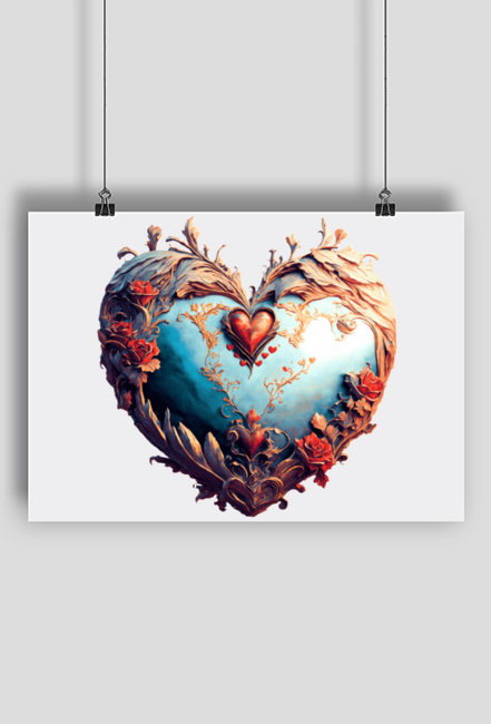 Ten obraz przedstawia ornament w kształcie serca. Ma misterne rzeźby i kwiatowe wzory, które nadają mu ozdobny i dekoracyjny wygląd. Serce ma gładkie, błyszczące wykończenie, podkreślające dbałość o szczegóły w jego wykonaniu.