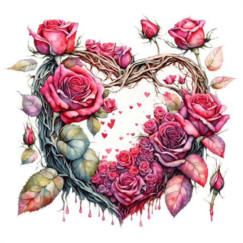 Ten obraz przedstawia układ różowych róż i zielonych liści w kształcie serca. Idealnie nadaje się do symbolizowania miłości, romansu, przyjaźni lub jakiejkolwiek wartości sentymentalnej. Użyj go, aby przekazać swoje emocje lub zaprosić kogoś do spędzenia z Tobą czasu w Walentynki.