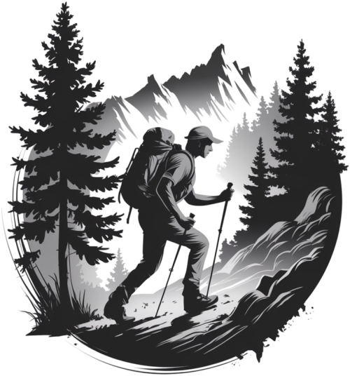 Ta monochromatyczna ilustracja uchwyca istotę przygody i wytrwałości, przedstawiając zdeterminowanego wędrowca pokonującego stromy, skalisty szlak. Scenę otaczają majestatyczne, wysokie świerki, a w tle wznoszą się dramatyczne sylwetki gór, dodając głębi i kontrastu. Gra ostrych krawędzi skał i miękkiego cieniowania lasu tworzy jednocześnie spokojną i dynamiczną atmosferę. Wyposażona w solidny plecak i kijki trekkingowe postać symbolizuje niezłomnego ducha eksploracji oraz głęboką więź z naturą. Ta kompozycja harmonijnie łączy ludzką determinację z majestatycznym pięknem dzikiej przyrody, inspirując widzów do odkrywania własnych przygód na łonie natury.