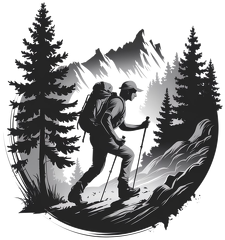 Ta monochromatyczna ilustracja uchwyca istotę przygody i wytrwałości, przedstawiając zdeterminowanego wędrowca pokonującego stromy, skalisty szlak. Scenę otaczają majestatyczne, wysokie świerki, a w tle wznoszą się dramatyczne sylwetki gór, dodając głębi i kontrastu. Gra ostrych krawędzi skał i miękkiego cieniowania lasu tworzy jednocześnie spokojną i dynamiczną atmosferę. Wyposażona w solidny plecak i kijki trekkingowe postać symbolizuje niezłomnego ducha eksploracji oraz głęboką więź z naturą. Ta kompozycja harmonijnie łączy ludzką determinację z majestatycznym pięknem dzikiej przyrody, inspirując widzów do odkrywania własnych przygód na łonie natury.