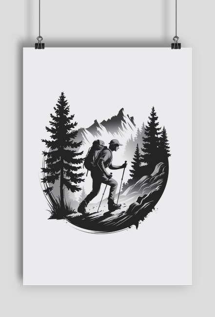 Ta monochromatyczna ilustracja uchwyca istotę przygody i wytrwałości, przedstawiając zdeterminowanego wędrowca pokonującego stromy, skalisty szlak. Scenę otaczają majestatyczne, wysokie świerki, a w tle wznoszą się dramatyczne sylwetki gór, dodając głębi i kontrastu. Gra ostrych krawędzi skał i miękkiego cieniowania lasu tworzy jednocześnie spokojną i dynamiczną atmosferę. Wyposażona w solidny plecak i kijki trekkingowe postać symbolizuje niezłomnego ducha eksploracji oraz głęboką więź z naturą. Ta kompozycja harmonijnie łączy ludzką determinację z majestatycznym pięknem dzikiej przyrody, inspirując widzów do odkrywania własnych przygód na łonie natury.