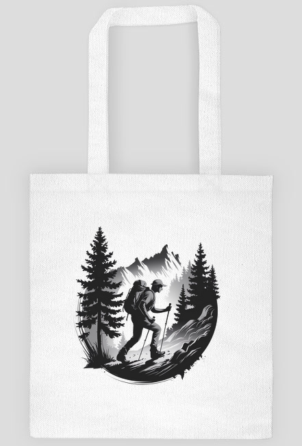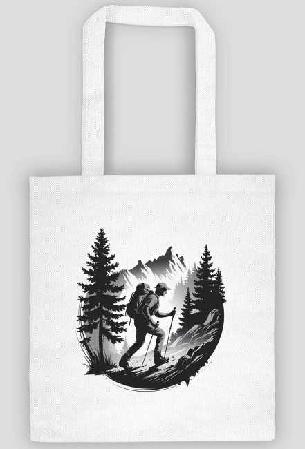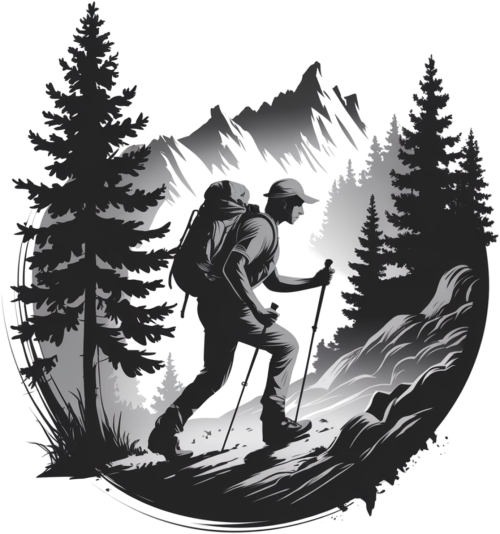 Ta monochromatyczna ilustracja uchwyca istotę przygody i wytrwałości, przedstawiając zdeterminowanego wędrowca pokonującego stromy, skalisty szlak. Scenę otaczają majestatyczne, wysokie świerki, a w tle wznoszą się dramatyczne sylwetki gór, dodając głębi i kontrastu. Gra ostrych krawędzi skał i miękkiego cieniowania lasu tworzy jednocześnie spokojną i dynamiczną atmosferę. Wyposażona w solidny plecak i kijki trekkingowe postać symbolizuje niezłomnego ducha eksploracji oraz głęboką więź z naturą. Ta kompozycja harmonijnie łączy ludzką determinację z majestatycznym pięknem dzikiej przyrody, inspirując widzów do odkrywania własnych przygód na łonie natury.