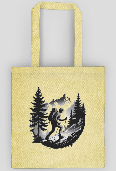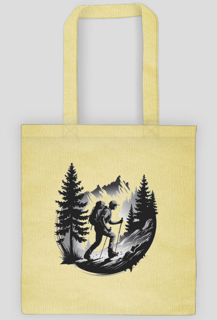 Ta monochromatyczna ilustracja uchwyca istotę przygody i wytrwałości, przedstawiając zdeterminowanego wędrowca pokonującego stromy, skalisty szlak. Scenę otaczają majestatyczne, wysokie świerki, a w tle wznoszą się dramatyczne sylwetki gór, dodając głębi i kontrastu. Gra ostrych krawędzi skał i miękkiego cieniowania lasu tworzy jednocześnie spokojną i dynamiczną atmosferę. Wyposażona w solidny plecak i kijki trekkingowe postać symbolizuje niezłomnego ducha eksploracji oraz głęboką więź z naturą. Ta kompozycja harmonijnie łączy ludzką determinację z majestatycznym pięknem dzikiej przyrody, inspirując widzów do odkrywania własnych przygód na łonie natury.