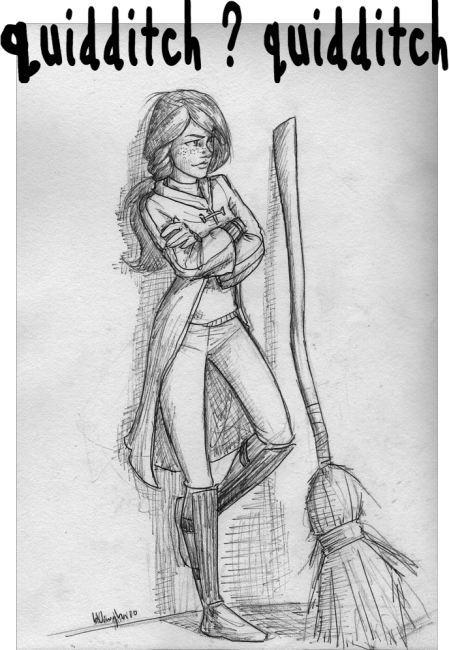 biała bluzka z rysunkiem dziewczyny ubranej w strój do quidditcha z miotłą . motyw z filmu "Harry Potter "