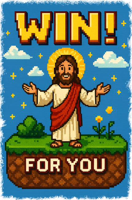 Ten pixelowy Jezus to połączenie klasyki retro z ponadczasową prawdą – pełen miłości, mocy i… oldschoolowego stylu. Idealny na koszulkę, kubek, bluzę czy torbę – dla dzieci, dorosłych, graczy i każdego, kto wie, że prawdziwe zwycięstwo już nadeszło.