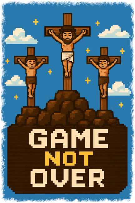 Pixelowy Golgota, trzy krzyże, a pod nimi napis, który mówi więcej niż tysiąc słów: „Game Not Over”.