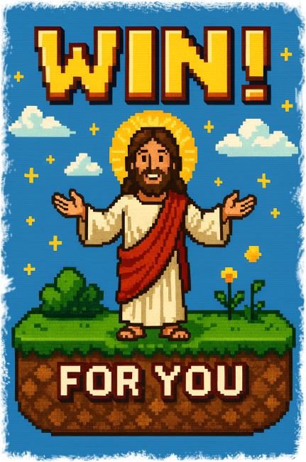 Ten pixelowy Jezus to połączenie klasyki retro z ponadczasową prawdą – pełen miłości, mocy i… oldschoolowego stylu. Idealny na koszulkę, kubek, bluzę czy torbę – dla dzieci, dorosłych, graczy i każdego, kto wie, że prawdziwe zwycięstwo już nadeszło.