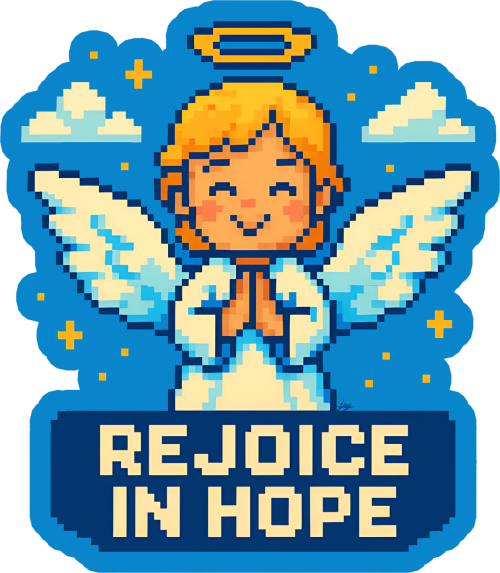 Uśmiechnięty aniołek w pixelowym stylu przypomina maluchom (i dorosłym!), że nadzieja to coś, z czego warto się cieszyć.