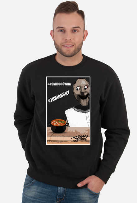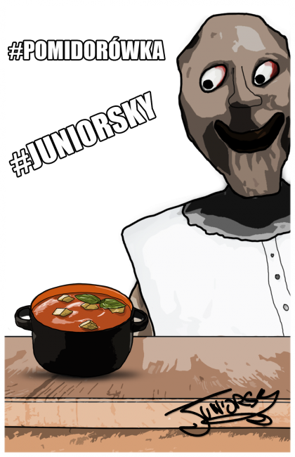 Produkt 'Granny', przedstawiający babcię, która patrzy na pomidorówkę, czyli ulubioną zupkę babci :)   Produkt jest z autentycznym podpisem Juniorskiego.