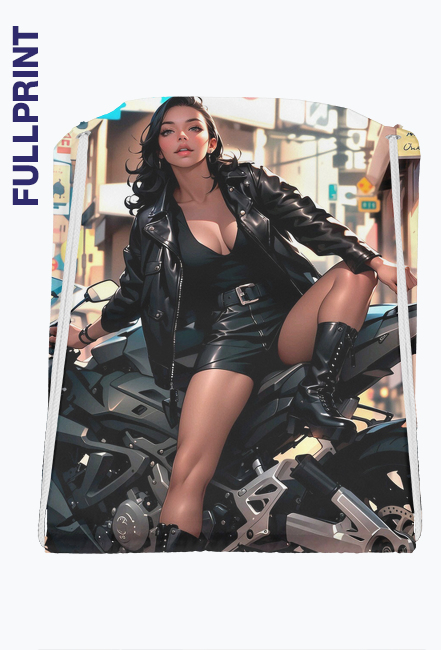 Worek gimnastyczny z grafiką kobiety na ścigaczu.