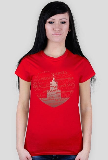 T-Shirt damski z kolekcji "Kocham Warszawę". Wzór 7 przedstawia napisy WARSZAWA ułożone w kształcie serca na tle sylwetki Pałacu Kultury i Nauki w Warszawie.