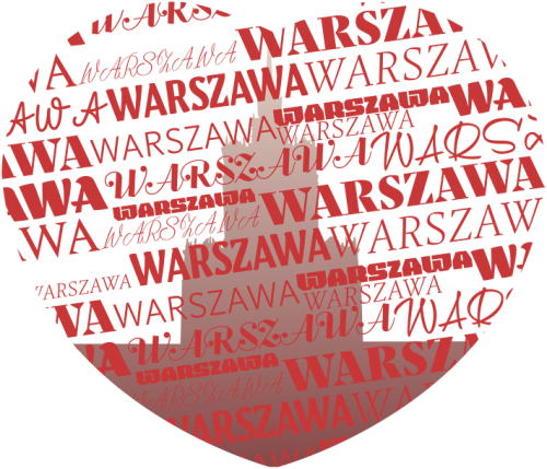 T-Shirt damski z kolekcji "Kocham Warszawę". Wzór 7 przedstawia napisy WARSZAWA ułożone w kształcie serca na tle sylwetki Pałacu Kultury i Nauki w Warszawie.