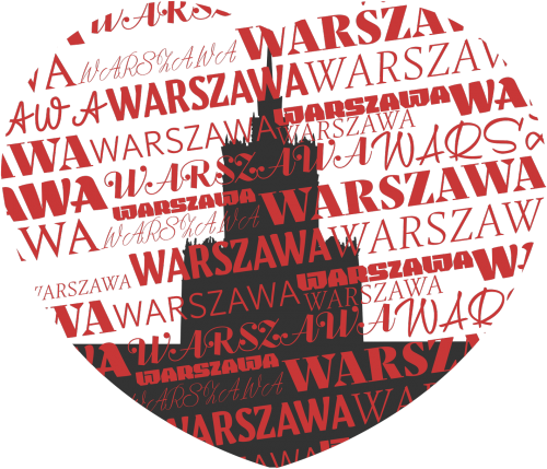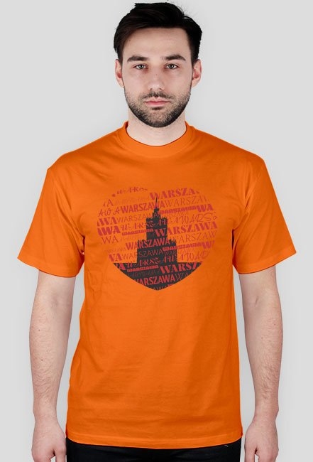 T-Shirt męski z kolekcji "Kocham Warszawę". Wzór 5 przedstawia napisy WARSZAWA ułożone w kształcie serca na tle sylwetki Pałacu Kultury i Nauki w Warszawie.