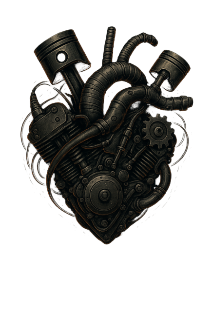 Serce z metalu, które bije w rytmie silnika. Ta grafika to hołd dla wszystkich, którzy zamiast krwi mają w żyłach benzynę, a ich serce napędzają tłoki, tryby i spaliny.