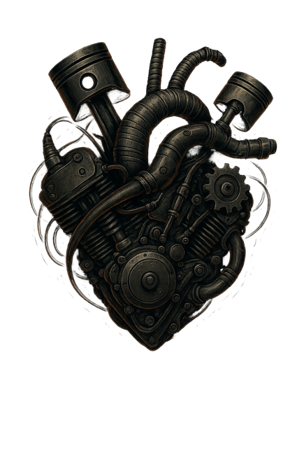 Serce z metalu, które bije w rytmie silnika. Ta grafika to hołd dla wszystkich, którzy zamiast krwi mają w żyłach benzynę, a ich serce napędzają tłoki, tryby i spaliny.