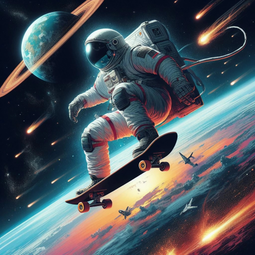 Ta ilustracja przedstawia astronautę jadącego na deskorolce w przestrzeni kosmicznej. Astronauta ma na sobie skafander kosmiczny i butle z tlenem i uśmiecha się, podróżując przez kosmos.