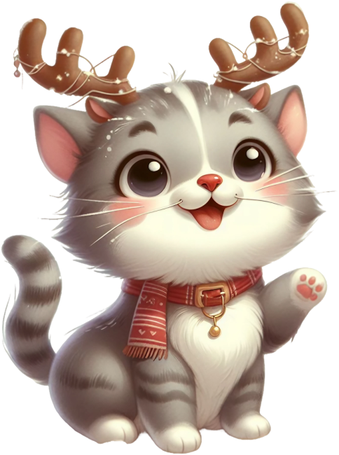 Ten uroczy bury kot jest gotowy na Boże Narodzenie! Z rogami renifera i świątecznym szalem jest idealnym świątecznym dodatkiem do każdego domu.