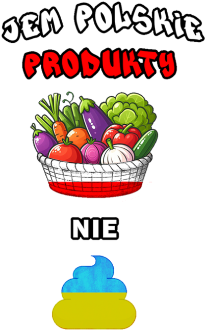 Jem Polskie Produkty to wyrazisty i kreatywny design dla osób, które cenią zdrowe jedzenie i lokalne produkty. Jeśli znasz kogoś, kto ceni świeżość i jakość polskich produktów, ten design jest dla nich idealny. Obraz przedstawia koszyk pełen kolorowych, świeżych warzyw, takich jak pomidory, marchewki, bakłażany, ogórki, czosnek i sałata. Każde warzywo jest szczegółowe i kolorowe, co wskazuje na świeżość i jakość. Poniżej koszyka z warzywami znajduje się napis “NIE” i ilustracja kupy w kolorach niebieskim i żółtym, która kontrastuje z atrakcyjnym wyglądem warzyw powyżej.