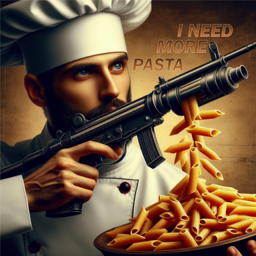 Grafika przedstawia humorystyczny obrazek, na którym szef kuchni trzyma karabin maszynowy, który zamiast pocisków strzela makaronem.