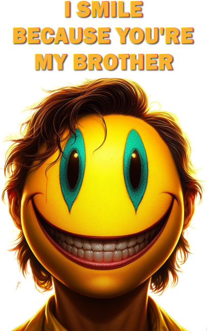 Grafika przedstawiająca postać z ludzką twarzą i nakładką z żółtej emotikonki. Postać ma brązowe włosy, niebiesko-zielone oczy i szeroki uśmiech, oraz widnieje napis. “Uśmiecham się, bo jesteś moim bratem”.