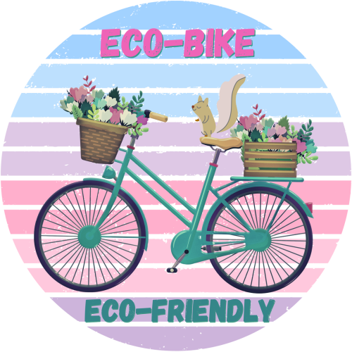 Motyw Rower z koszami kwiatów na tle popularnego tła retro sunset w pastelowych kolorach z napisami eco-bike i eco-friendly to idealny wybór dla tych fanów dwóch kółek, którzy cenią sobie zarówno styl vintage, jak i dbałość o środowisko.