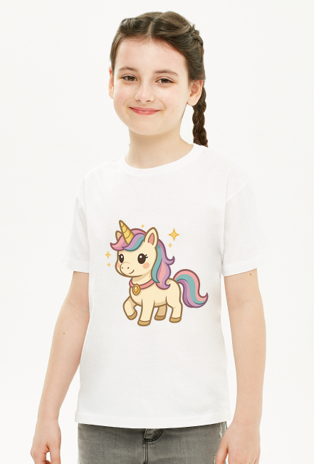 Ta miękka koszulka dziecięca z kolorowym nadrukiem magicznego jednorożca to idealny wybór dla małych marzycieli i miłośników bajek. Lekka, wygodna i pełna czarów!