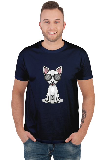Na przodzie koszulki widnieje duży, kolorowy nadruk przedstawiający sympatycznego psa. Pies ma na sobie okulary z okrągłymi, przyciemnianymi szkłami, dodającymi mu wyjątkowo inteligentnego wyglądu. Może to być rasa o zabawnym wyrazie twarzy, jak buldog francuski, pug, czy labrador, co tylko potęguje humorystyczny charakter koszulki.